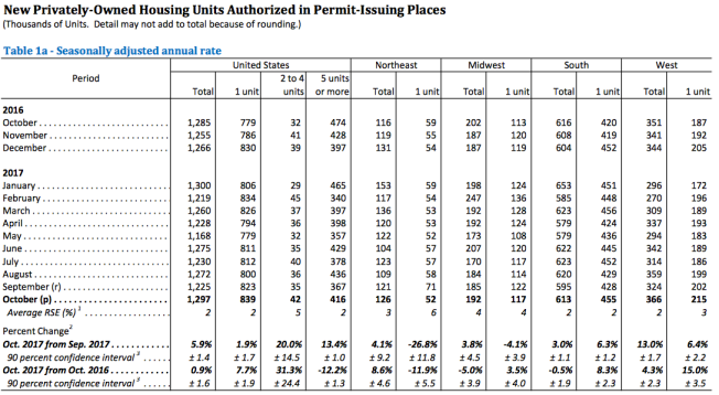 Building permits in October were at a seasonally adjusted annual rate of 1,297,000, 5.9% above the revised September rate of 1,225,000 and is 0.9% above the October 2016 rate of 1,285,000. Single-family authorizations in October were at a rate of 839,000, 1.9% above the revised September figure of 823,000.