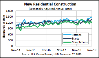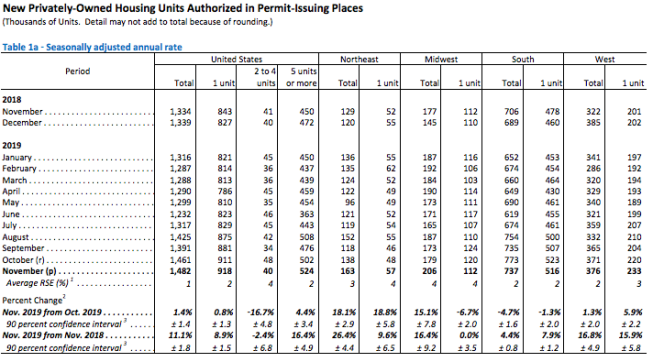 Building permits in November were at a seasonally adjusted annual rate of 1,482,000, 1.4% above the revised October rate of 1,461,000 and is 11.1% above the November 2018 rate of 1,334,000.