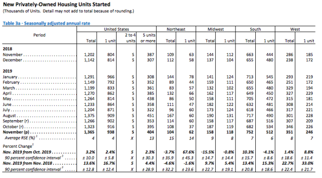 Housing starts in November were at a seasonally adjusted annual rate of 1,365,000, 3.2% above the revised October estimate of 1,323,000 and 13.6% above the November 2018 rate of 1,202,000, the Census Bureau and Dept. of Housing and Urban Development reported Tuesday.