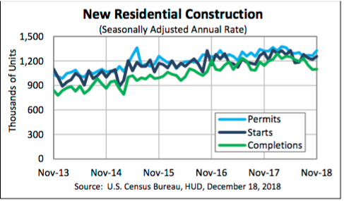 Housing completions in November rose 0.4% to a seasonally adjusted annual rate of 1,099,000, 3.9% below the November 2017 rate of 1,144,000. Single‐family housing completions in November were at a rate of 772,000, 5.4% below the revised October rate of 816,000. The November rate for units in buildings with five units or more was 314,000.