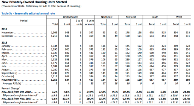 Housing starts in November rose 3.2% to a seasonally adjusted annual rate of 1,256,000, the Commerce Department reported Tuesday. Despite the gain, starts were still 3.6% below the November 2017 rate of 1,303,000.