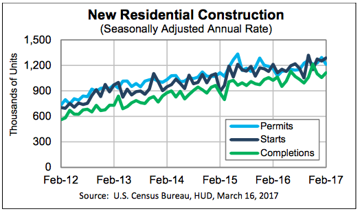 Housing completions in February were at a seasonally adjusted annual rate of 1,114,000, 5.4% above the revised January estimate of 1,057,000 and 8.7% above the February 2016 rate of 1,025,000. Single-family housing completions in February were at a rate of 754,000, 6.5% below the revised January rate of 806,000. The February rate for units in buildings with five units or more was 344,000, up from 247,000 in January.