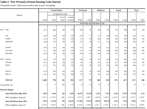 Housing starts in June came in at a seasonally adjusted annual rate of 1,189,000, up 4.8% from the revised May estimate of 1,135,000 but 2.0% below the June 2015 rate of 1,213,000, the Commerce Department reported Tuesday.