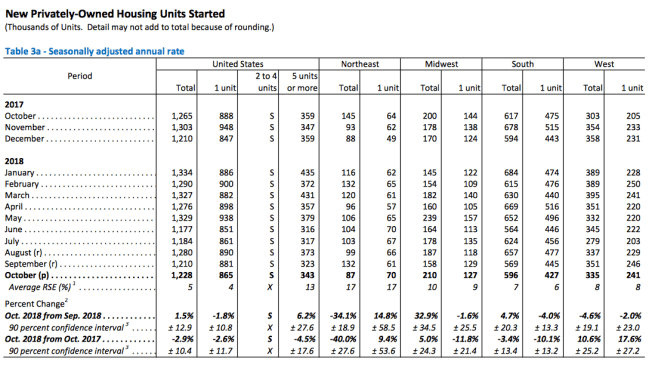 Housing starts in October rose 1.5% from September to a seasonally adjusted annual rate of 1,228,000, 2.9% below the October 2017 rate of 1,265,000, the Commerce Department reported Tuesday.