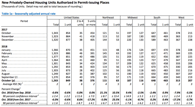 Building permits in October fell 0.6% sequentially to at a seasonally adjusted annual rate of 1,263,000., 6.0% below the October 2017 rate of 1,343,000.
