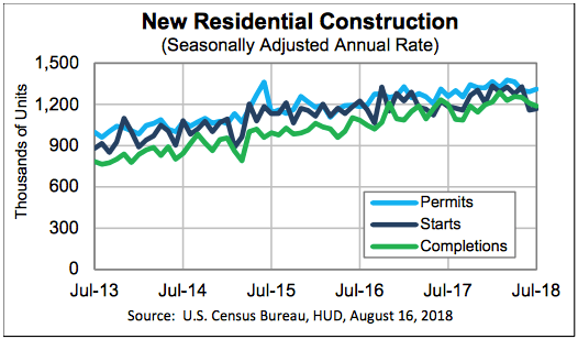 Housing completions in July were at a seasonally adjusted annual rate of 1,188,000, 1.7% below the revised June estimate of 1,209,000 and 0.8% below the July 2017 rate of 1,197,000. Single-family housing completions in July were at a rate of 814,000, 5.2% below the revised June rate of 859,000.