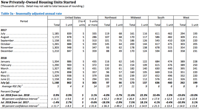 Housing starts in July rose 0.9% from June to a seasonally adjusted annual rate of 1,168,000, 1.4% behind the pace of July, 2017, the Commerce Department reported Thursday. Economists were looking for a rate of 1.27 million, according to MarketWatch.