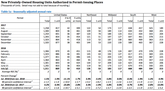 Building permits in July were at a seasonally adjusted annual rate of 1,311,000, 1.5% above the revised June rate of 1,292,000 and 4.2% above the July 2017 rate of 1,258,000. Single-family authorizations in July were at a rate of 869,000, 1.9% above the revised June figure of 853,000.