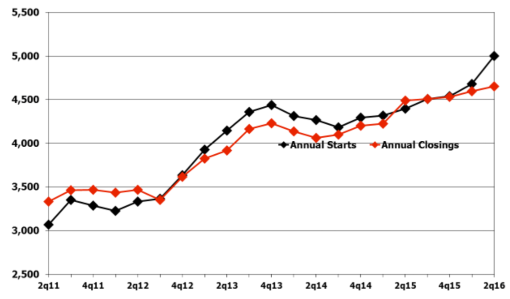 Metrostudy’s 2Q16 survey of the Indianapolis housing market shows that there were a total of 5,001 new housing starts in the region over the twelve months ending in 2Q16, a 13.8% increase from 2Q15. The 1,628 units started in 2Q16 represent a significant increase of 25.8% over 2Q15. The annual rate of closings numbered 4,652 units in 2Q16, up 3.6% from the prior year. Quarterly closings increased 5% YoY to 1,267 closings.