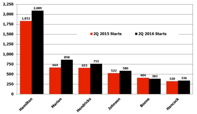 “The second quarter is the first time annual starts came in over 5,000 since the recession and quarterly new home starts had the strongest single quarter since 2007,” said Mark Gianopulos, Regional Director of Metrostudy’s Indianapolis office. “The largest growth in annual starts occurred in Hamilton, Marion and Hendricks counties, with gains of 14%, 29.2% and 15.6% respectively. With the exception of Boone County, all markets in the Metrostudy survey saw an increase in construction activity in 2Q16 compared to 2Q15. A modest decline was seen in Boone County, while starts were relatively healthy in the remaining counties, up by single-digit gains compared to the same period last year.”