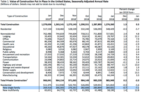 Spending on private construction was at a seasonally adjusted annual rate of $966.0 billion, 0.2% above the revised December estimate of $964.2 billion. Residential construction was at a seasonally adjusted annual rate of $511.4 billion in January, 0.3% below the revised December estimate of $512.9 billion. New single family spending was down 0.7% from December and 7.2% below January, 2018.