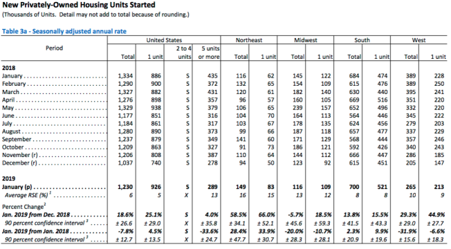 Housing starts in January were at a seasonally adjusted annual rate of 1,230,000, 18.6% above the revised December estimate of 1,037,000 but 7.8% below the January 2018 rate of 1,334,000, the Census Bureau and Department of Housing and Urban Development reported Friday.