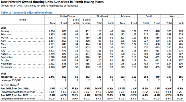 Building permits in January were at a seasonally adjusted annual rate of 1,345,000, 1.4% above the revised December rate of 1,326,000 but 1.5% below the January 2018 rate of 1,366,000. Single‐family authorizations in January were at a rate of 812,000 2.1% below the revised December figure of 829,000. Authorizations of units in buildings with five units or more were at a rate of 482,000 in January.
