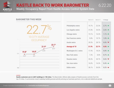 Across these 10 major cities, the average occupancy rate currently stands at 22.7%. Kastle will be releasing updates to the data on a weekly basis.