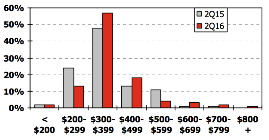 Our average “offer to build” base price for new homes in active projects increased to $419K, up about 8% from one year ago. The average price has been increasing steadily since 2012. Start activity has shifted over last year into the price ranges above $300K as builders adjust pricing to offset increased land and construction costs. This quarter we are seeing starts continue to shrink in the range below $300K. Affordability remains a concern as home prices are rapidly increasing. Builders are trying to provide lower priced homes. Last year, 26% of all new home starts were under $300k; this year only 15% were priced below $300k.