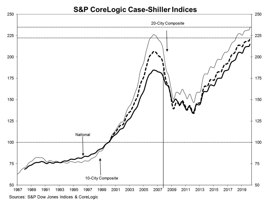 “That said, housing prices continue to be remarkably stable. The National Composite Index rose by 4.4% in March 2020, with comparable growth in the 10- and 20-City Composites (up 3.4% and 3.9%, respectively). In all three cases, March’s year-over-year gains were ahead of February’s, continuing a trend of gently accelerating home prices that began last autumn. March results were broad-based. Prices rose in each of the 19 cities for which we have reported data, and price increases accelerated in 17 cities.