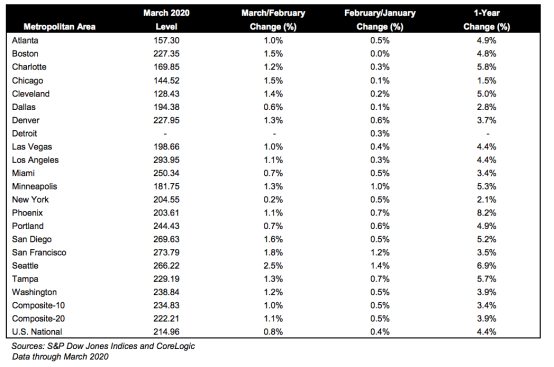 “March’s data witnessed the first impact of the COVID-19 pandemic on the S&P CoreLogic Case-Shiller Indices,” said Craig J. Lazzara, managing director and global head of index investment strategy at S&P Dow Jones Indices. “We have data from only 19 cities this month, since transactions records for Wayne County, Michigan (in the Detroit metropolitan area) were unavailable.