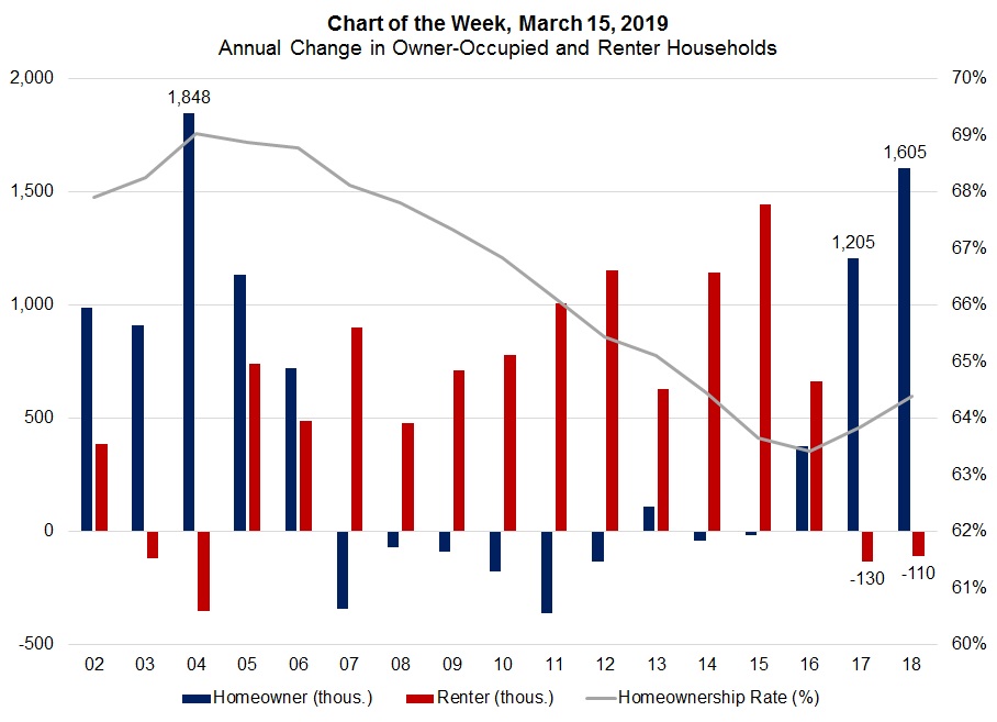 MBA forecasts for purchase originations to increase around 4% to $1.24 trillion in 2019, with another year of growth to $1.27 trillion in 2020. What’s behind the optimistic forecast? According to the U.S. Census Bureau, there were 1.6 million additional owner-occupied households in 2018 – the largest annual increase since 2004. In addition to the healthy labor market, improving supply conditions (in some markets) and moderating home-price growth, downsizing baby boomers and more millennials entering their prime buying years are creating sustained demand for home purchases. This week’s chart takes a look at the annual change in owner-occupied and renter households from 2002-2018. After nine years of mostly contraction in owner-occupied households, it’s hard not to notice that 2018 was the third straight year of growth. This trend is likely to continue.