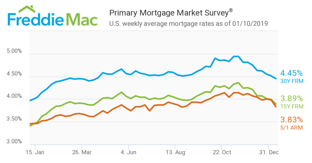 • 30-year fixed-rate mortgage (FRM) averaged 4.45% with an average 0.5 point for the week ending January 10, 2019, down from last week when it averaged 4.51%. A year ago at this time, the 30-year FRM averaged 3.99%.