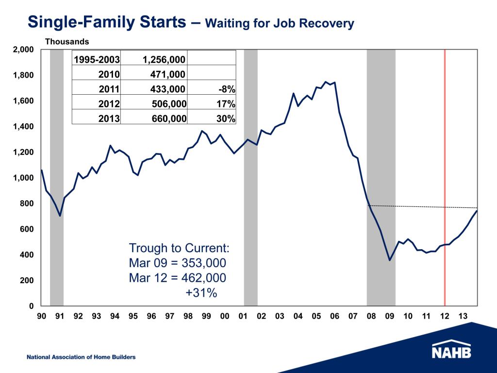 NAHB delivered its forecast on the same day Federal Reserve chairman Ben Bernanke reiterated that a “depressed” housing market was thwarting stronger economic expansion, and nine days after the Census Bureau estimated that annualized housing starts in March had fallen to their lowest level in five months.