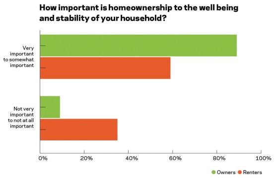 Americans have a conflicted view toward housing today, to be sure. The survey findings show that a full 72 percent of the country still believes that owning a home is an important part of their family’s dream and the American economy. And in our focus groups most people concurred that achieving homeownership says something about a family’s success and stability.