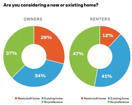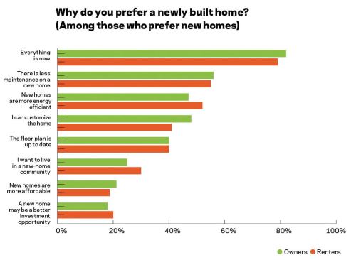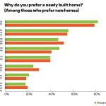 Builders really have their work cut out for them today, considering that more people prefer existing homes over new homes, and that those existing homes are perceived to be much less expensive. Even so, 29 percent of current homeowners would prefer to buy a new home, if they bought another. What do people like best about new homes? “Everything is new” was the top response, cited by 82 percent of current homeowners.