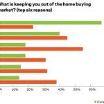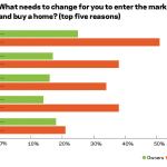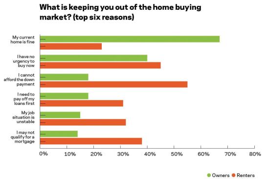 Renters are much less satisfied with where they currently live—only 25 percent say their current home is fine. But 45 percent said they have no urgency to buy either. Why don’t they move? The top reason was that they don’t have the money for a down payment (55 percent), and they are afraid they won’t qualify for a mortgage (38 percent). Also, about one-third of renters said they would have to pay off other loans and land better jobs before they would move.