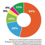Retirement housing plans vary. Slightly more than half of respondents (54 percent) expect to stay in their current home for their entire retirement. Another 18 percent want to stay in their current home first then move later, and 13 percent plan to move to another home, or their second home, upon retirement, or had already done so.
