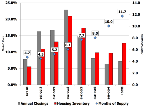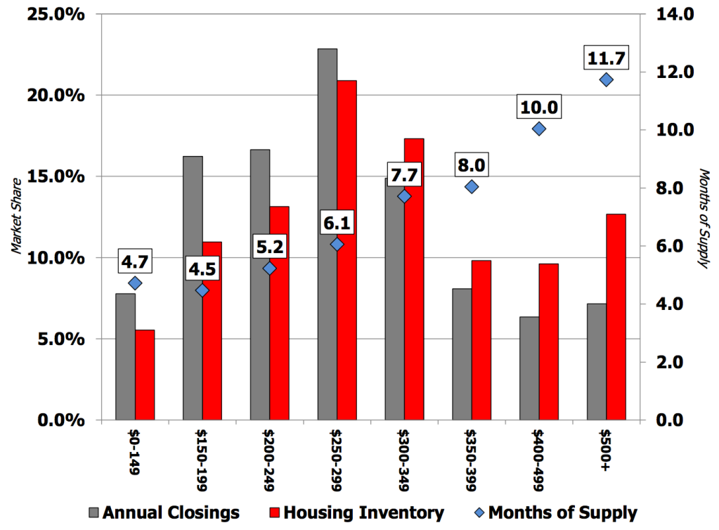The fastest growing price segment in the Charlotte market during 2Q16 was the market for homes priced from $300,000 up to $399,999. New home starts in that segment were up 34.7% from 2Q15 and new occupancies (closings) were up 39% versus a year ago. This segment has a 21.2 months’ supply of developed lots, and a 7.8 months’ supply of housing inventory. Both metrics are considered to be within the normal range considering building and development timeframes. The below $299,999 segments are all under supplied by traditional measures. The least supplied across all price segments, when factoring in both horizontal and vertical supply, is the $200,000 to $249,999 segment with a 5.2 months’ supply of vertical units, and an 18.6 months’ supply of lots.