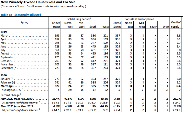 Sales of new single‐family houses in March 2020 dropped 15.4% to a seasonally adjusted annual rate of 627,000, according to estimates released jointly today by the U.S. Census Bureau and the Department of Housing and Urban Development. The pace was 9.5% below the March 2019 estimate of 693,000.