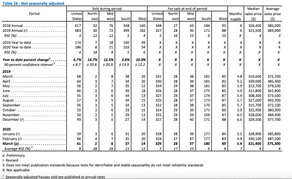 The median sales price of new houses sold in March 2020 was $321,400. The average sales price was $375,300, both down from the prior month but still ahead of a year earlier.