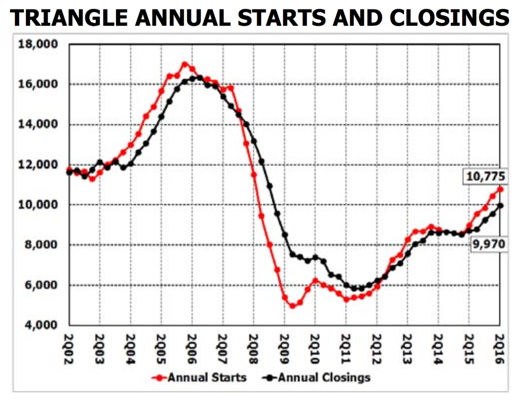 Metrostudy’s 2Q16 survey of the Triangle housing market shows that 3,050 new homes were started, up 12.3% from 2Q15. Quarterly closings – previously unoccupied new homes that now are occupied – totaled 2,770 units, a 14.3% increase from 2Q15. Annual starts surveyed through the end of 2Q16 numbered 10,775, 20% higher than the same period a year ago. Annual closings numbered 9,970 in 1Q16, 14% more than 2Q15.