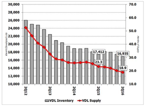 The 16,935 vacant developed lots (VDL) in the Triangle in 2Q16 represent a decrease of 447 lots from the 17,412 lots surveyed in 2Q15. At the current absorption rate, these lots represent an 18.9- months’ supply. Metrostudy considers 18-24 months to be normal, as on average that is the amount of time it takes to entitle and deliver new home lots to the market. In some submarkets, lots supplies are significantly under the 18-month mark, while in others the months-of-supply of lots remains above the 24-month mark.