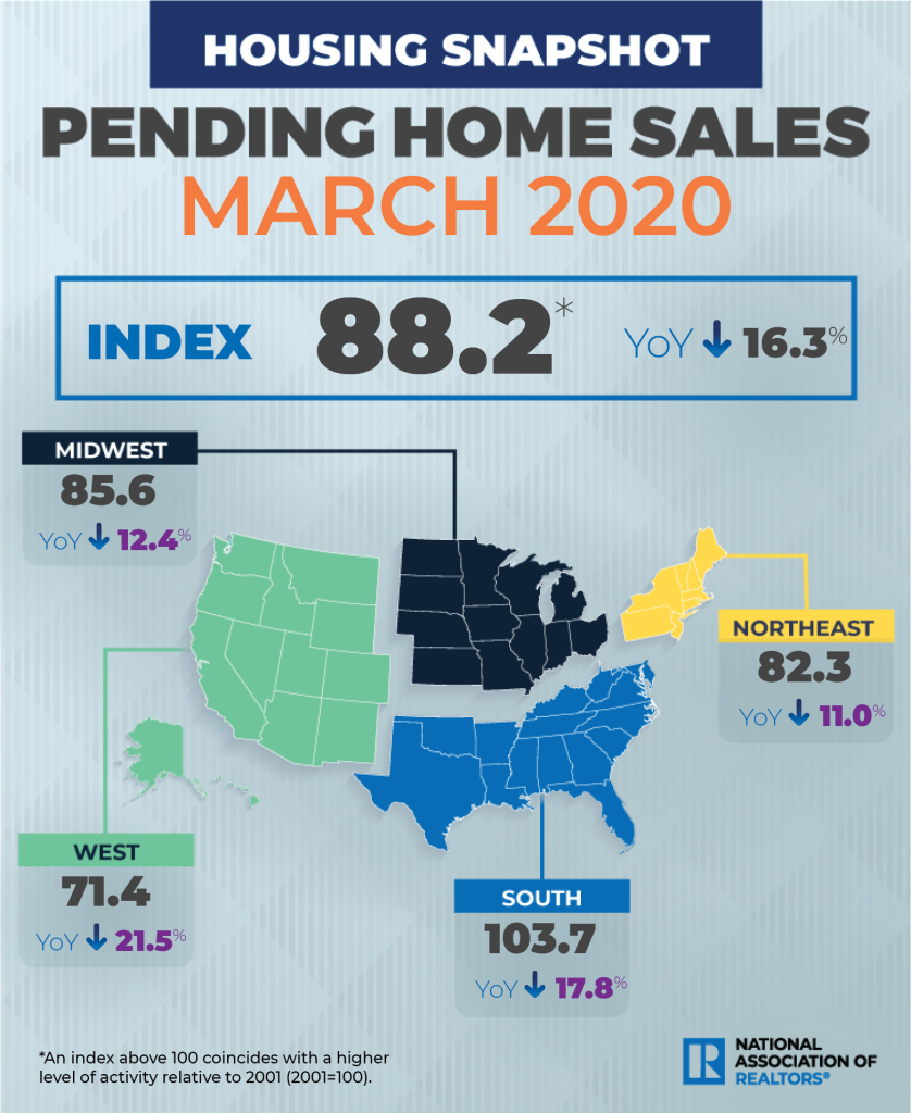Pending home sales fell in March, seeing expected declines as a result of the coronavirus outbreak, according to the National Association of Realtors. Each of the four major regions saw drops in month-over-month contract activity and year-over-year pending home sales transactions.