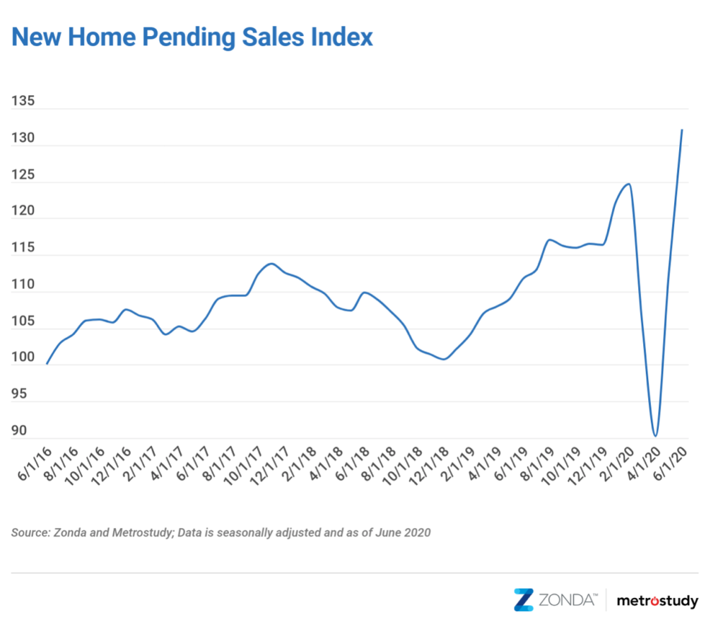 The latest New Home Pending Sales Index (PSI) from Meyers Research for June 2020, backed by data from Zonda and Metrostudy, shows pending sales increased month over month and year over year across the United States. The index is a leading residential real estate indicator based on the number of new-home sales contracts signed across the country.