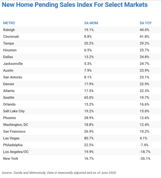 Pending new-home sales continued to show major locational differences, but all of the select 20 markets in the country posted month-over-month gains and nearly all trended above June 2019 as well.