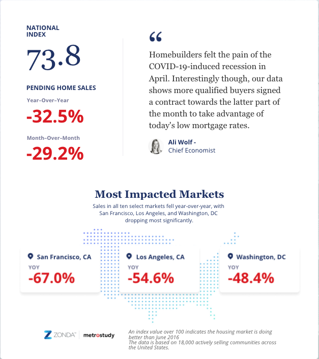 • San Francisco, Los Angeles, and Washington, DC experienced the largest pullback in contract sales on a year-over-year basis. These markets have higher than average home prices, some denser urban real estate, and stricter stay-at-home orders, which contributed to many buyers deciding to pull a wait-and-see strategy.