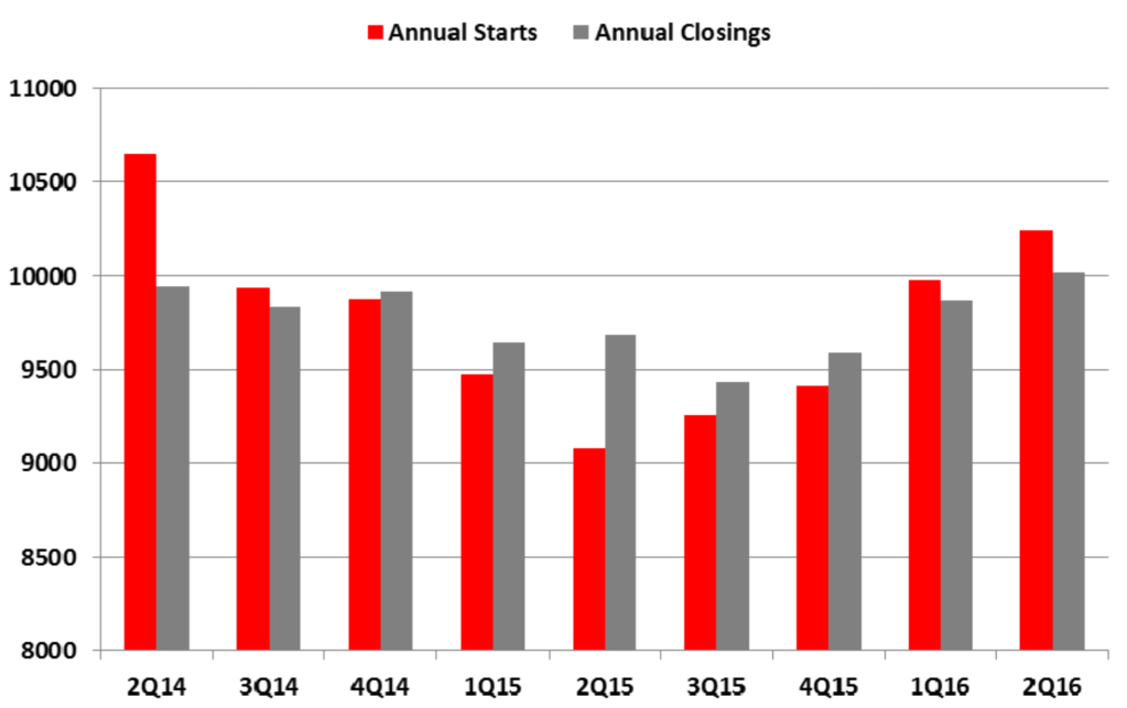The Philadelphia MSA had 1,483 starts for 2Q16, a big 21.7% gain from 1Q16 and 4.6% YoY. Annual starts came in at 5,529, a 1.2% increase from 1Q16 and up 14.5% over 2Q15. Closings for the MSA came in at 1,184, an uptick of 5.2% from last quarter but an 8.1% decrease YoY. Annual closings came in at 5,264 for 2Q16, down 2% from last quarter but up 2% over 2Q15.