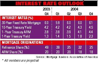 With an economic recovery evidently under way, the debate on Wall Street rages on about the implications for home builders going into 2004. The NAHB forecasts a 10-year Treasury yield that “does not deviate far from the current 4.5 percent rage through mid-2004 [on a quarterly average basis],” says chief economist David Seiders. That bodes well for builders. “An increase of 1 percent in mortgage rates, which translates into an after-tax payment increase of roughly $40 per week, is not going to keep our customers from buying their dream home,” added Cooper.