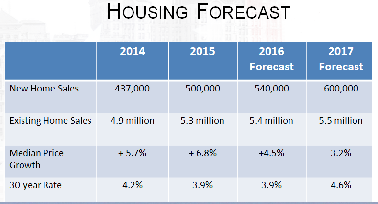 Yun’s forecast projects existing sales to finish 2016 at a pace of around 5.40 million – the best year since 2006 (6.48 million). Prices should end the year up between 4% and 5%, a slowdown from last year’s torrid 6.8% pace.