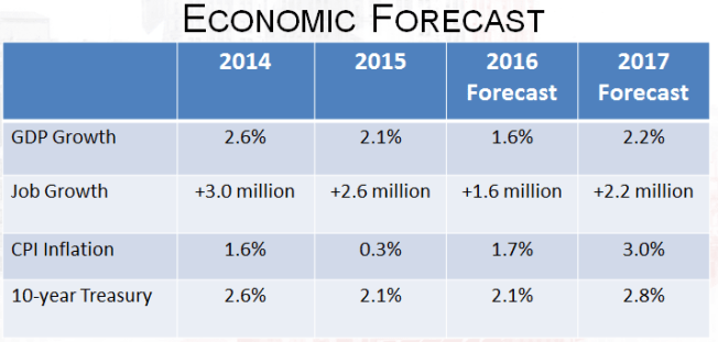 Despite solid job gains in the past few years, Yun said that economic growth continues to be unimpressive. The rising U.S. dollar against other foreign currencies and the slowing global economy since late last year would likely be causing our economy to teeter on the edge of a recession if it weren’t for the boost from the housing component of Gross Domestic Product. Through the rest of the year, he expects GDP to register at only 1.6% and be primarily kept afloat by housing and consumer spending.