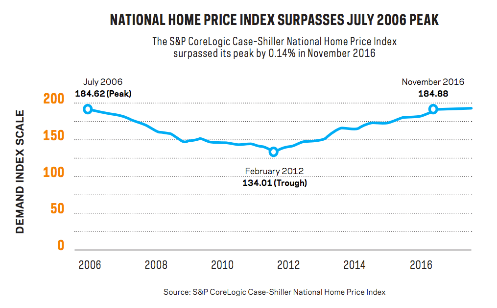 In January, home prices reached a 31-month high, according to the S&P CoreLogic Case-Shiller U.S. National Home Price Index. More notably, the index surpassed its 2006 peak in November, after a year of significant increases. Low resale inventory in many major markets has driven buyers to the new-home market, but high prices continue to slow conversions or price out potential home buyers. Demand for new homes exists, and, according to our March Metrostudy-BUILDER Demand Index, it continues to grow. But low supply of new homes in affordable bands are keeping buyers away.