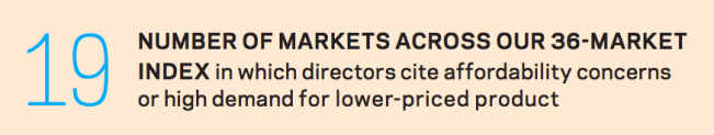 Our monthly gauge of buyer interest in 36 major markets has risen 10% since March 2016. The average score of 7.82 in March signals a strong spring selling season ahead, yet that might not apply to all markets. Builders in markets like the Twin Cities are still struggling to control costs as development and land costs rise, making the buyer and builder price issue an endless cycle. In Las Vegas, weekly sales center traffic is at an all-time high, yet conversions have decreased. Despite concerns about low inventory of entry-level product, the majority of regional directors are on the up-and-up about spring selling season.