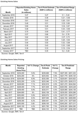 Ten-X, the online real estate transaction marketplace, was out Friday with its latest Ten-X Residential Real Estate Nowcast, which reports existing home sales several weeks before the National Association of Realtors report comes out. The report predicts existing home sales will decrease slightly in October to a seasonally adjusted annual rate (SAAR) between 5.2 and 5.49 million with a targeted number of 5.35 million, down 0.8% from NAR’s reported September sales.