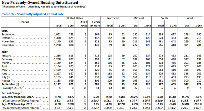 Housing starts took a significant hit from Hurricane Harvey, which drove starts down sharply in the South region and caused the overall national number to come in 4.7% behind August to an annualized rate of 1,127,000. Starts, however, were up 6.1% from a year earlier.