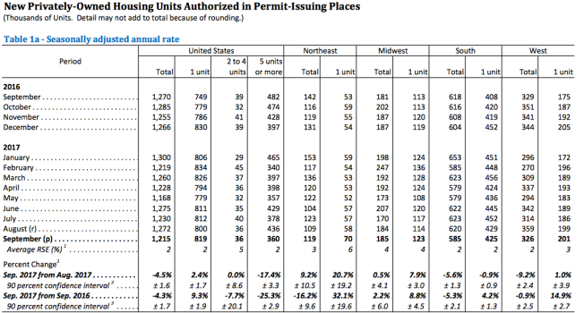 Building permits in September were at a seasonally adjusted annual rate of 1,215,000, 4.5 % below the revised August rate of 1,272,000 and 4.3% below the September 2016 rate of 1,270,000. The decline was driven by the multifamily sector, which posted a 17.4% decline. Single-family authorizations in September were at a rate of 819,000, 2.4% above the revised August figure of 800,000 and 9.3% ahead of the same month last year.