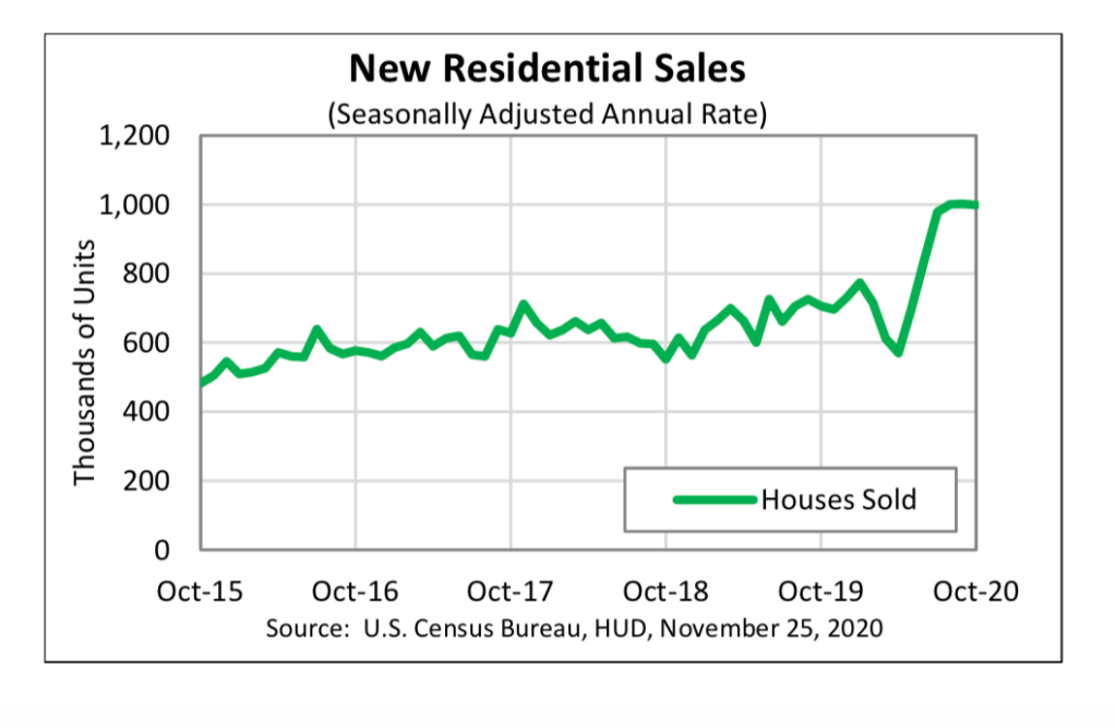 The continued elevated new-home sales follows other strong residential market indicators for the month of October. Zonda reported this week that pending new-home sales were tracking higher year over year in nearly every top U.S. market. And existing home sales were up 26.6% from a year ago, according to the National Association of Realtors.