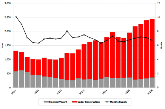 For the twelve months ending June 30, 2016, new homes starts in price ranges under $250K totaled 1,544 units, up 12.4% from 2Q15. In 2Q16, annual new homes starts in prices over $250K were up 42.9% YoY. The marginal 1,329-unit increase in the annual start pace was split: 170 more units under $250K and 1,159 more units above $250K.