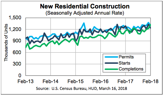 Housing completions in February were at a seasonally adjusted annual rate of 1,319,000, 7.8% above the revised January estimate of 1,224,000 and 13.6% above the February 2017 rate of 1,161,000. Single-family housing completions in February were at a rate of 895,000, up 3.0% from the revised January rate of 869,000. The February rate for units in buildings with five units or more was 418,000, up 21.5% sequentially and up 9.4% year-over-year.