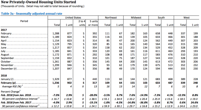 Single-family housing starts in February were at a rate of 902,000, 2.9% above the revised January figure of 877,000 and also 2.9% ahead of February, 2017. The February rate for units in buildings with five units or more was 317,000, down 28% sequentially and 19.1% year-over-year.